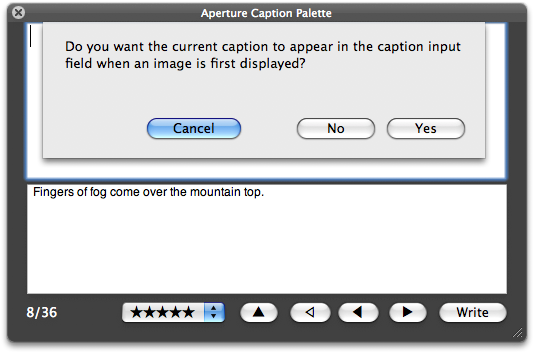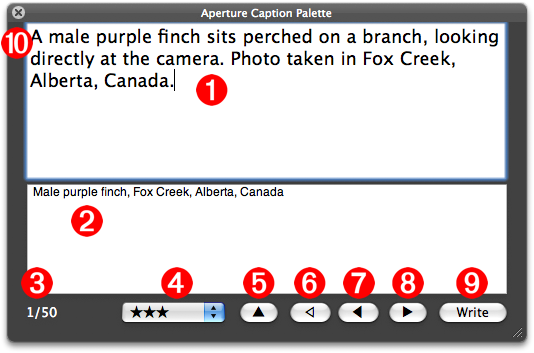 - Write Button (Command-4) Click this button to write the contents of the caption input field to the image caption tag. After writing the data, the next image in the list of selected images will be displayed.