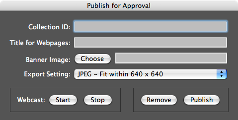 If you wish to permanently remove a published collection, launch the Publish for Approval application and click the Remove button to be presented with a list of the currently active collections. Select the collections to remove, and the folders containing the images and webpages will be moved to the trash.