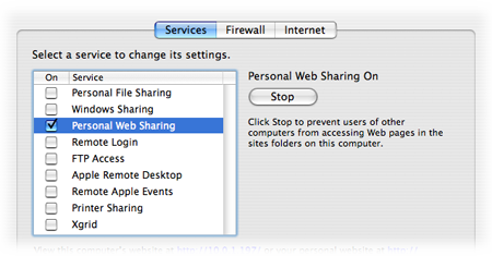 - Turn on Personal Web Sharing in the Services tab of the Sharing system preference.