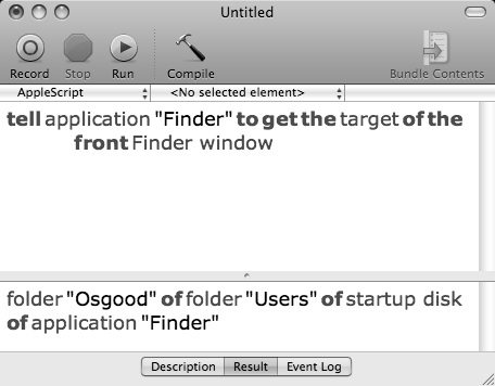 As you can see, the result of this script is a reference to the folder whose contents are displayed in the Finder window, in this case your home directory. This reference describes the target folder in terms of its position in its object hierarchy or where it is in its “Chain of Command.”