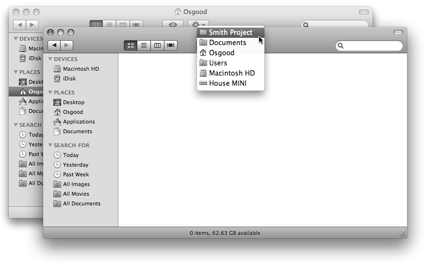 First, in the front Finder window, navigate to your Documents folder in your Home directory. In the Documents folder, create a new folder named “Smith Project.” We’ll use this folder in the following examples.