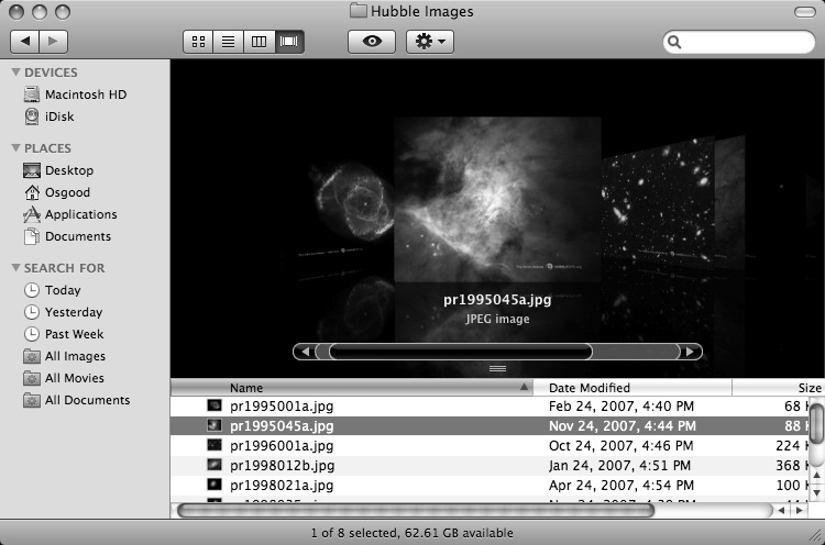 The next Finder window property we’ll examine is the current view property. The value of this property is the method used to display the contents of the Finder window, and can be one of four enumerations: icon view, list view, column view, and (new in Mac OS X v10.5) flow view. Like the target and toolbar visible properties, this property can be both read and edited: