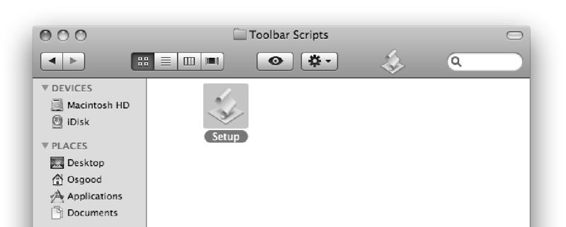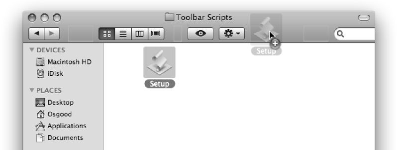 Now, in your home directory, open the Toolbar Scripts folder you just created. Drag the Setup script applet icon to the Finder window toolbar, and release the mouse once the cursor changes to include a plus sign (+).