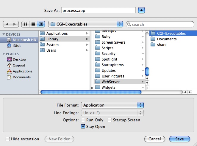 Save it as an application (not an application bundle) with the Stay Open option checked. On Mac OS X, CGIs are usually placed in the Library > WebServer > CGI-Executables folder.