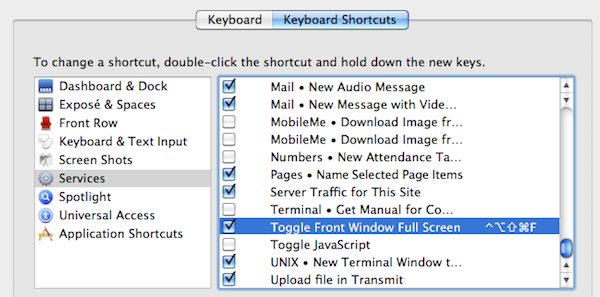 - Select the Keyboard Shortcuts tab in the Keyboard preference pane in the System Preferences application. Select the Toggle Front Window Full Screen service from the list of services, and press the Return key. Now press the key combination you want to use to run the service.