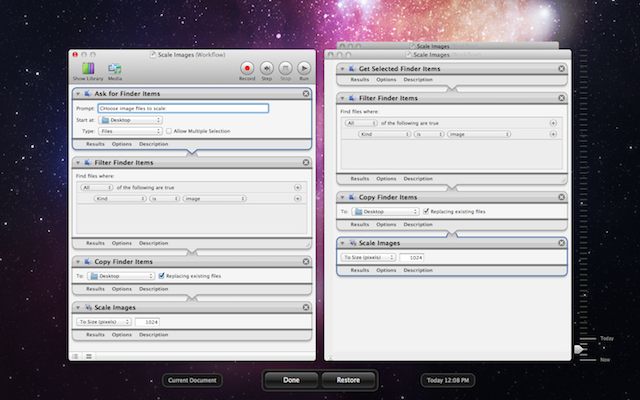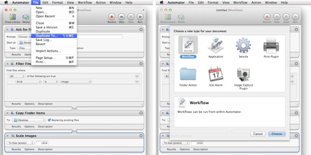 The challenge of changing an existing Automator workflow into another type of Automator plugin has been resolved. Workflows can now be duplicated to another template types, such as from an applet to a service, or from a service to a print plug-in.