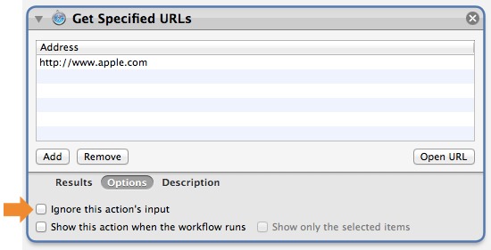 Many actions have the option to ignore input from a previous action in a workflow. To make it easier to access this control, it has been moved into the action options drawer, which is displayed when you click the Options button at the bottom left of the action view.
