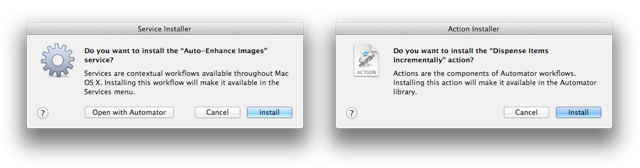 Installer applications are no longer required in order to add an Automator action or service to your library of actions and services. Just double-click the action or service workflow files, and you will presented with a dialog prompting you to approve the installation of the selected action and service workflow files. If approved, any selected actions will be placed in the user Library > Automator folder, and any selected service workflow files will be placed in the user Library > Services folder, and be ready for use immediately.