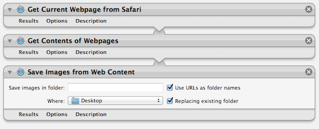 - Save Images from Web Content This action takes as input, web content, and then extacts any images within the passed datat and writes them to a folder on disk. The example workflow shown below, will extract the images from the current webpage displayed in Safari: (learn more)