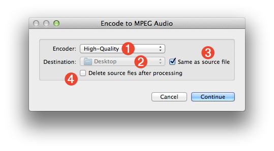 Using the Encode to MPEG Audio action, MPEG audio files can be created from audio source files of types AIF, WAV, CAF, and SDII.