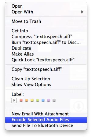 By default, Mac OS X Lion includes a built-in Automator Service for encoding video files on the desktop. To access the service, simply select one or more video source files in the Finder, and launch the service by selecting it from the Finder's contextual menuaction menu, or Services menu in Finder application menu.