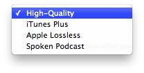 popup menu (1) offers four options that determine the type and amount of compression to be applied to the source audio files: High-Quality (128 kbps, 44.1 kHz), iTunes Plus (256 kbps, 44.1 kHz), Apple Lossless, and Spoken Podcast (22.05 kHz).