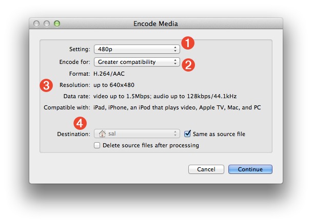 popup menu (2) offers two options that determine the range of devices supported targeted by the chosen encoding settings: Greater quality, and Greater compatibility. Using the compatibility settings produces a lower quality video that is compatible with a larger range of devices. - The particulars of the encoding parameters, determined by the combination of the two popup menus, is displayed below in the action view (3). Output format, data rate, and display size are shown. In addition, the Apple devices that support the chosen encoding parameters are listed for reference.