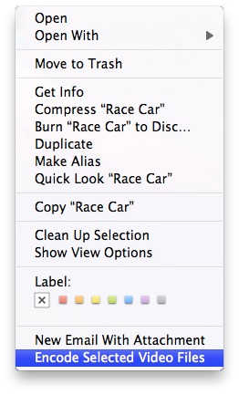 By default, Mac OS X Lion includes a built-in Automator Service for encoding video files on the desktop. To access the service, simply select one or more video source files in the Finder, and launch the service by selecting it from the Finder's contextual menuaction menu, or Services menu in Finder application menu.