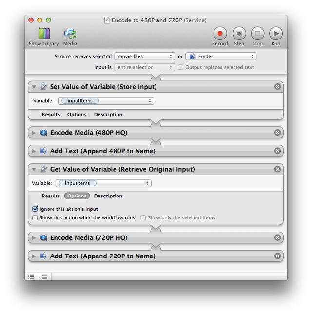In the service workflow example below, passed movie files are encoded to both 480P and 720P, producing two encoded files for each movie passed to the workflow. NOTE that the forth action in the workflow (the one that retrieves the original list of dragged-on items from the variable inputItems) has its execution options set to ignore input from the previous action so that it doesn't attempt to process the files already encoded and renamed by the previous actions.