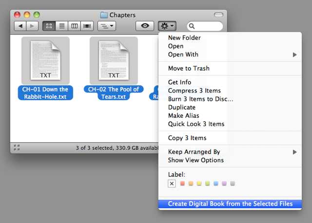 Open the folder named "Chapters," select the three text files, and then choose the "Create Digital Book from the Selected Files" service from the Finder action menu:
