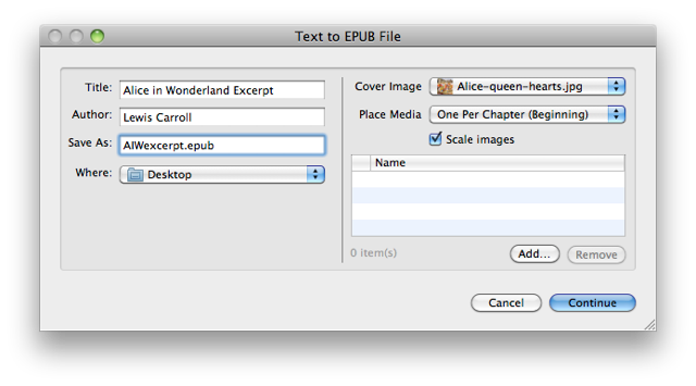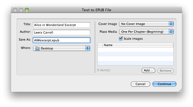 The "Text to EPUB" dialog will appear. The dialog is the view for the Automator action that does the work of creating the publication. The left side of the dialog is for entering information about the publication and determining the name and location for the created EPUB document. The right side of the dialog is for identifying any optional media you wish to add to the publication.