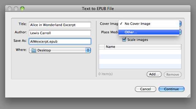 Next, add the cover image by selecting "Other…" from the cover image popup menu on the right side of the dialog: