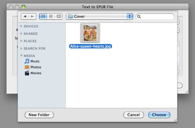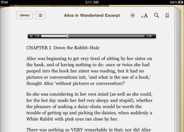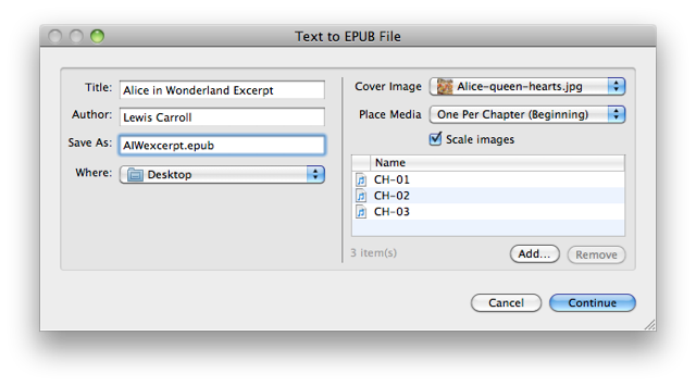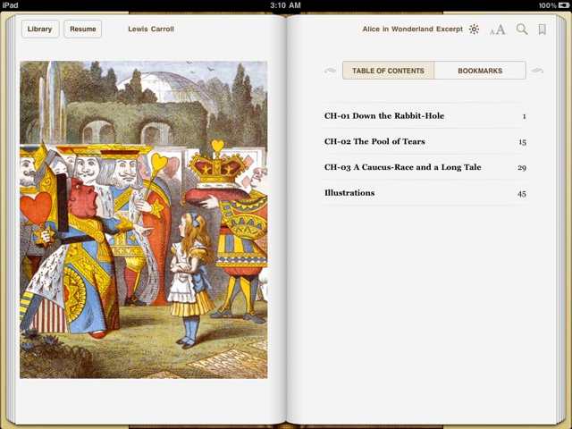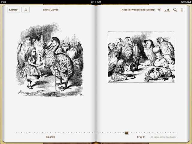 The digital publication created by the following tutorial, is one that includes optional media, namely spoken narration audio clips (provided by Librivox) placed at the beginning of each chapter, and a collection of images from the original Alice in Wonderland book placed in an illustrations chapter at the end of the book. In addition, the digital book is assigned a cover image that will appear as the book's cover in the iBooks library.