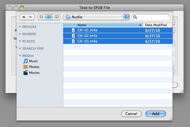 Next, you'll add add the audio clips to the book. By default, one media item (image, audio file, or video file) will be inserted at the beginning (or end) of each chapter. Since there are three chapters, we'll add three corresponding audio files, which will be inserted one per chapter. Click the "Add…" beneath the media list area to summon a dialog for selecting media files: