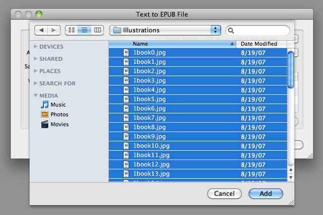 Next, we’ll add the illustrations to the media list. By default, the action will place any media not assigned to a chapter, in a chapter at the end of the book named "Illustrations." Click the "Add…" beneath the media list to summon the picker dialog, then navigate the the Illustrations folder in the demo kit, select all the illustration images, and Click the "Add" button:
