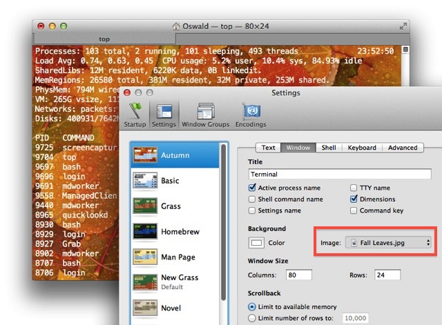 The standard Terminal window settings include a new translucent setting named Aerogel. (above)
