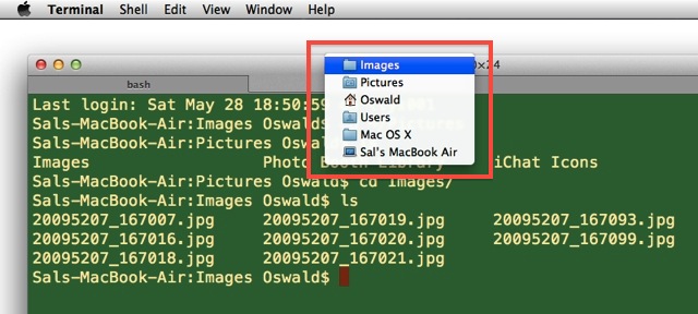 (above) In Lion, the proxy icon in a Terminal window is an alias to the current directory, whose path hierarchy can be displayed by clicking on the title bar while holding down the Command (⌘) key.