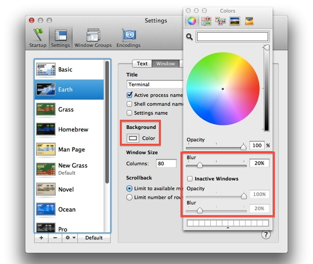 Color, blur, and opacity options are available for Terminal windows. These are accessed on the color picker palette, summoned by clicking on the color well in the (above)