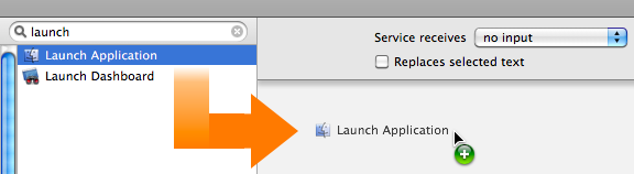 Now that the input settings have been applied, locate the Launch Application action by entering its name in the search field to the left of the data input bar. It will be displayed in the action list below the search field. Drag the action title to the area after the data settings bar, and release the mouse to add the action.