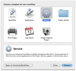 When Automator is launched, it displays a Template Chooser as drop-down sheet connected to the new Automator window. The various template options represent the ways you can deploy the Automator workflow you are creating. Select the Services template and press the Choose button to close the Template Chooser sheet.