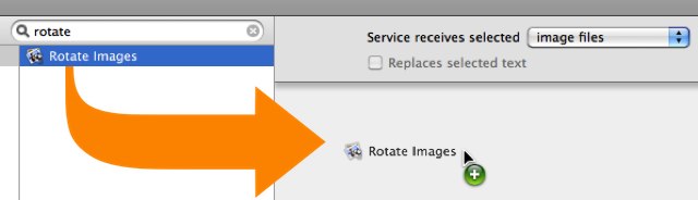 Now that the input settings have been applied, locate the appropriate Automator action for rotating image files, by entering the keyword “rotate” in the search field to the left of the data input bar. The Rotate Images will be displayed in the action list below the search field. Drag the action title to the area after the data settings bar, and release the mouse to add the action.