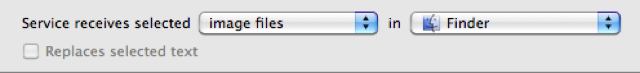 For this example, the workflow will process image files selected in the Finder, so choose Images Files as the input type from the first popup menu, and Finder from the second popup menu. Since the input type is not text-based, the checkbox will automatically be disabled.