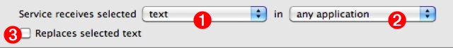 A gray bar will be displayed across the top of the workflow area of the Automator window. This bar displays the settings that indicate (1) the type of data to be processed by the workflow, (2) the application in which the service will be available, and (3) whether or not to replace any selected text with the result of the service workflow.