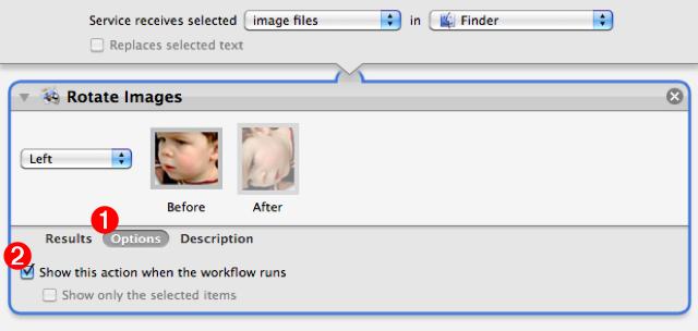 The logic of this sservice will be to display a panel of rotation options to the user, allowing them to choose which direction in which to rotate the selected images. To accomplish this, Rotate Images action view will need to be displayed each time the wervice is run. This ability can be set in the action's parameters. Click the Options button at the bottom of the action view (1), and then check the Show this action when the workflow runs checkbox (2). The action view will now appear each time the service workflow is executed.