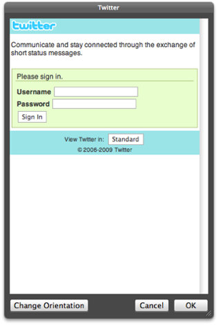 This service is designed to give you quick access to Twitter without the need for relying on a full-sized web-browsing application. To summon the HUD, simply type the keyboard shortcut you assigned to the service, and login when the mobile version of Twitter appears: