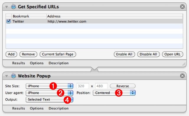The Website Popup is designed to display a floating HUD window, showing the website whose URL is passed from the previous action in the workflow. Its action view contains parameters for: (1) indicating the size of the floating window; (2) whether the content of the website is viewed as from within Safari, or from within the iPhone; (3) the HUD's default postion on the screen; and (4) what type of information is returned by the action after the HUD is closed or dismissed.