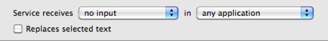 For this example, the workflow will present a floating HUD window displaying the mobile version of the Twitter website. The service will require no input and should be available any time and from within any application. Accordingly, these should be the settings for the input dialog in the workflow: