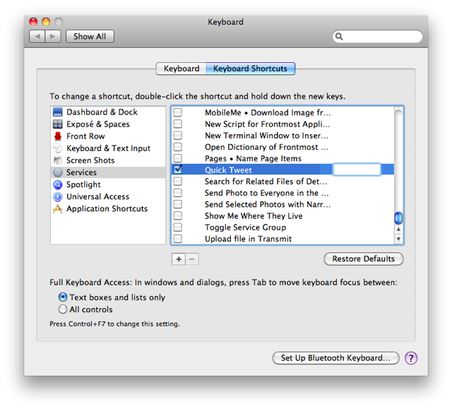 The final step in creating and setting up this workflow, is to assign a keystroke combination to the newly created service. Open the System Preferences application and navigate to the Keyboard preference pane, and select the Keyboard Shortcuts tab. From the list on the left of the preference pane, select the Services category. A list of the installed services will be displayed to the right. Locate the Quick Tweet service in the list, select it, and press the Return key to activate the keyboard input cell. Type the key combination you wish to assign to the service (maybe: Control-Shift-T), then quit the System Preferences application.