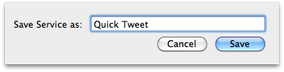 Choose Save from Automator's File menu and in the drop-down naming sheet, enter the name for this service: Quick Tweet